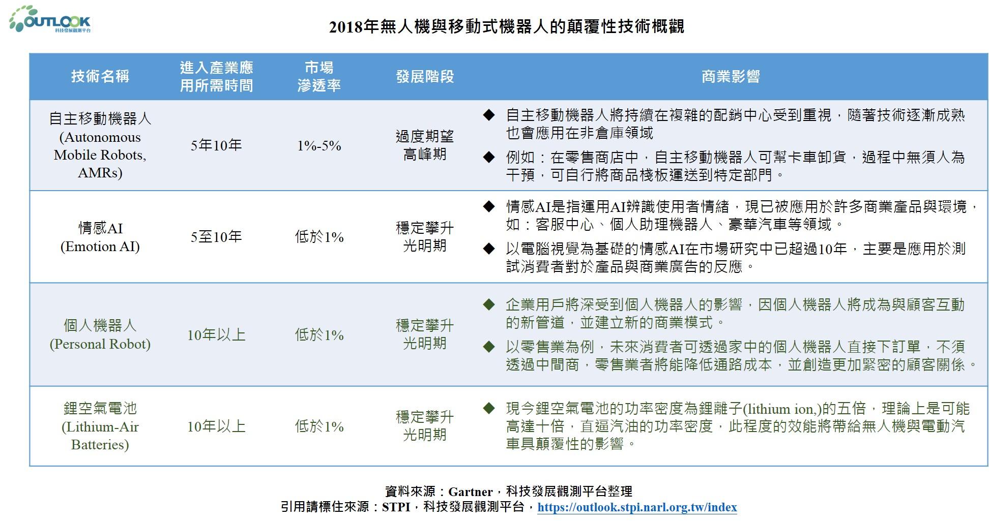 將無人機與移動式機器人部署於人類難到達的偏遠地區,以進行感測與資料處理,其可提供更高的安全性、更優異的表現,以及更低的成本。在2018年Gartner的無人機與移動式機器人的技術報告中,具顛覆性效益的技術如:機器學習(Machine Learning)、鋁空氣電池(Aluminum-Air Batteries)、移動式機器人(Autonomous Mobile Robots, AMRs)、情感AI(Emotion AI)、生技-培養組織或人工組織(Biotech — Cultured or Artificial Tissue)、個人機器人(Personal Robot),以及鋰空氣電池(Lithium-Air Batteries)共七項。其中,僅情感AI(Emotion AI)取代了2017年奈米碳管電子(Nanotube Electronics)技術,其餘顛覆性技術皆與2017年相同。