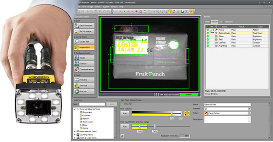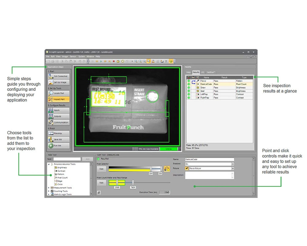 即便是新手,亦能使用 In-Sight 資源管理器軟體搭配 EasyBuilder 簡易的直覺式視窗,達到可靠的檢測性能;所有的 In-Sight 視覺系統都配備有這個視窗。需執行更複雜的合格/不合格與通過/不通過檢測時,使用者能以自身的體驗為基礎,使用更先進的 In-Sight Explorer 視覺系統建立視覺應用。