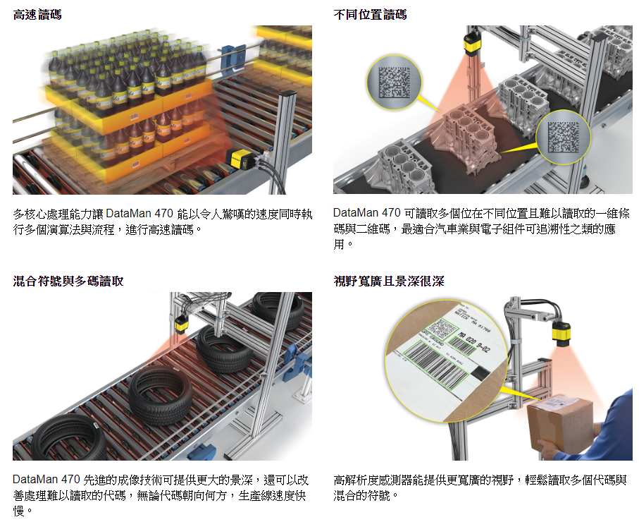 康耐視COGNEX DataMan 470 系列固定式讀碼器可輕鬆解決複雜的高產能製造業與物流業應用。DataMan 470 擁有多核心處理能力,成像技術,高解析度感測器,先進的解碼演算法,且設定簡單,提供的涵蓋範圍最大,速度最快又簡單易用。