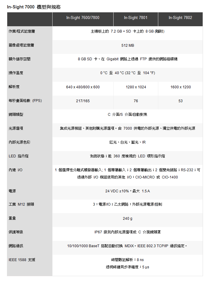 康耐視COGNEX In-Sight 7000 系列提供單色與彩色機型,還有從 VGA 至 5MP 的解析度。還提供各種不同的工具配置,從 In-Sight 7500 基本工具組到功能完備的 7600,7800 和 7900 機型。