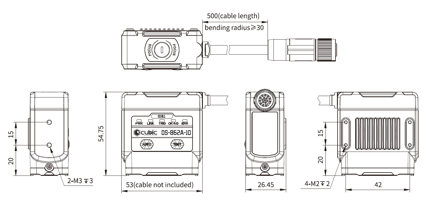 CUBIC DS-862A-10產品特點 選用高性能圖像傳感器。 外型小巧、緊湊,適應更多工業應用場景。 具備手動調焦。 支援TCP/IP、Serial、FTP、HTTP等傳輸協議。 內置深度學習讀碼算法,高效讀取各類條碼及二維碼,無懼髒污和破損等干擾。 I/O接口豐富,可接入多路輸入及輸出信號。