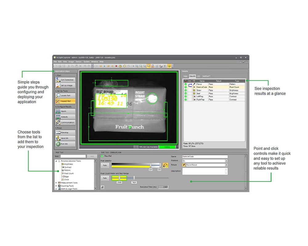 即便是新手,亦能使用康耐視COGNEX In-Sight 資源管理器軟體搭配 EasyBuilder 簡易的直覺式視窗,達到可靠的檢測性能;所有的 In-Sight 視覺系統都配備有這個視窗。需執行更複雜的合格/不合格與通過/不通過檢測時,使用者能以自身的體驗為基礎,使用更先進的 In-Sight Explorer 視覺系統建立視覺應用。