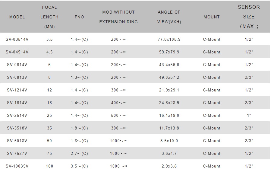 共有f3.5~f100mm11個機種。專門為機器視覺使用而進行的設計
