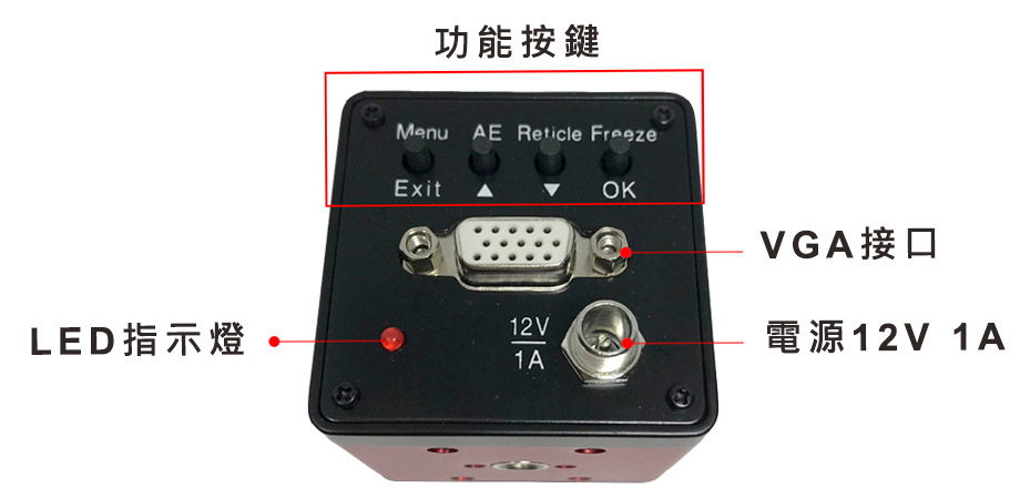 中間為VGA介面,直接連接任何支援XGA模式的顯示器。下方為工作指示燈及電源輸入埠。工作指示燈在正常工作時會一亮一滅的閃爍。上方四個按鍵為功能按鍵。這四個按鍵有兩種操作模式。預設處於第一種操作模式。可實現調出功能表項目(Menu鍵),自動曝光功能(AE鍵),十字線顯示與消隱(Reticle鍵)及凍結功能(Freeze鍵)。按功能表鍵後這四個鍵就進入第二種操作模式。四個鍵分別完成“退出”,“上調”,“下調”,“確認”功能。