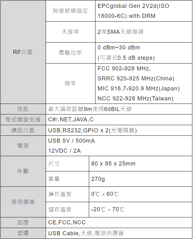 UHF320是高性能多協議 UHF RFID讀寫器,提供2埠天線傳送最佳的尺寸、運行效率、RF功率和靈活性,固定式的UHF RFID 應用中需要尺寸小是非常重要的。另外在性能提昇上可高速讀取標籤,在功能應用上UHF320 的射頻功率輸出範圍廣 0dBm 至+30dBm 可充份滿足各種使用情境設定調整,最大讀取距離超過9米。提供完整開發 API 支援,並支持廣泛的各種硬體及作業系統連接、配置和控制。 CUBIC 致力於推動降低部署 RFID 所需技術門檻,我們設計產品好用的外在結構,並提供可預測,可靠和可重複性能。我們的開發工具只需要很少的 RFID 專業知識使您能夠快速設計,測試和部署 RFID 解決方案。
