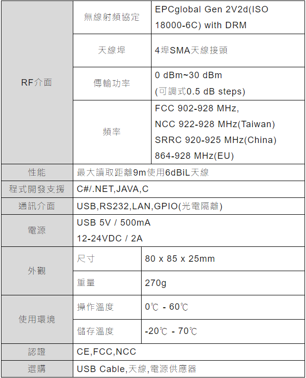UHF340是高性能多協議 UHF RFID讀寫器,提供4埠天線傳送最佳的尺寸、運行效率、RF功率和靈活性,固定式的UHF RFID 應用中需要尺寸小是非常重要的。另外在性能提昇上可高速讀取標籤,在功能應用上UHF340 的射頻功率輸出範圍廣 0dBm 至+30dBm 可充份滿足各種 使用情境設定調整,最大讀取距離超過9米。提供完整開發 API 支援,並支持廣泛的各種硬體及作業統連接、配置和控制。 CUBIC 致力於推動降低部署 RFID 所需技術門檻,我們設計產品好用的外在結構,並提供可預測,可靠和可重複性能,我們的開發工具只需要很少的 RFID 專業知識使您能 夠快速設計,測試和部署 RFID 解決方案。