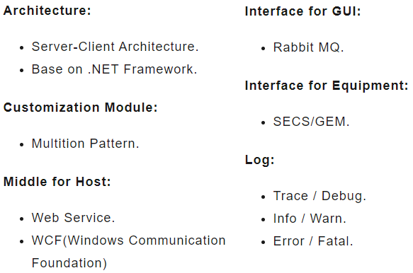 - EAP: 工廠自動化系統程式之一,讓排程派工有所依據,提高機台使用效能,降低成本提高機台生產率。提供一完整自動化方案,在機台連線下,協助減少人為在量產時的疏失,提高產品良率,達成無人工廠的最終目的。