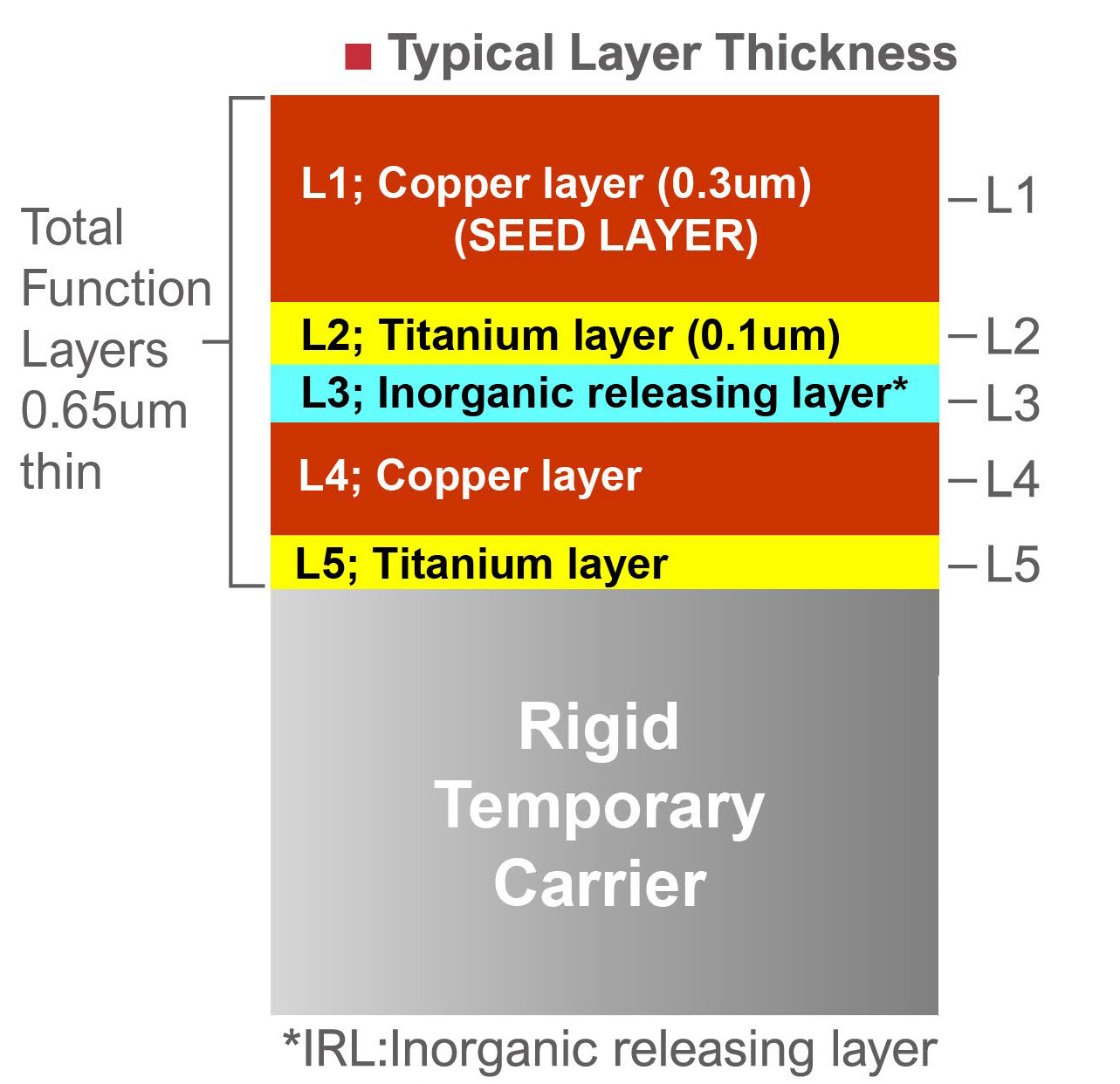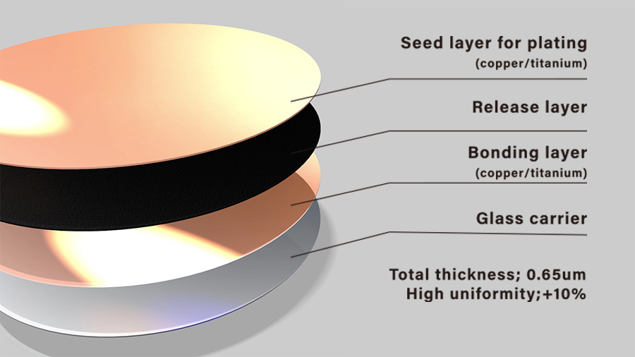 應用於扇出型先進封裝, Carrier上面帶五層功能性結構層,超薄化五層厚度僅0.65um。